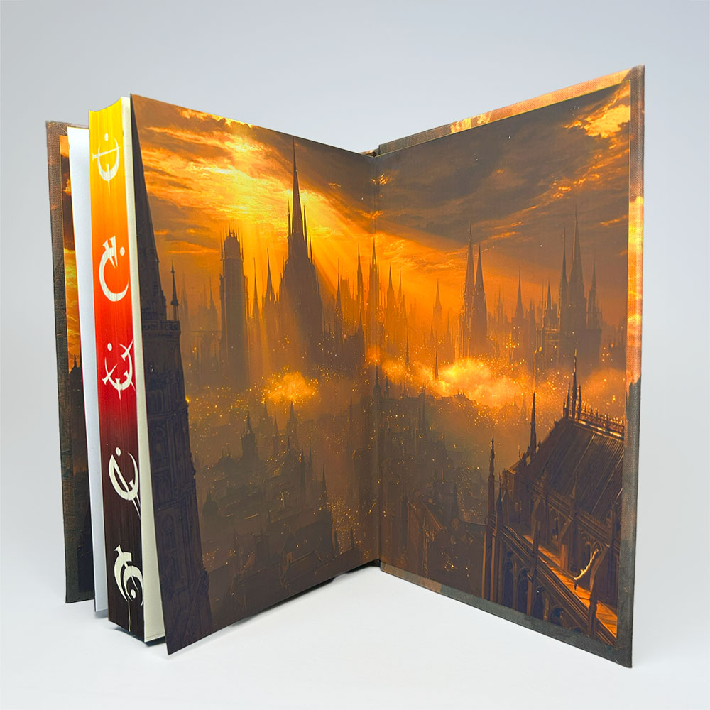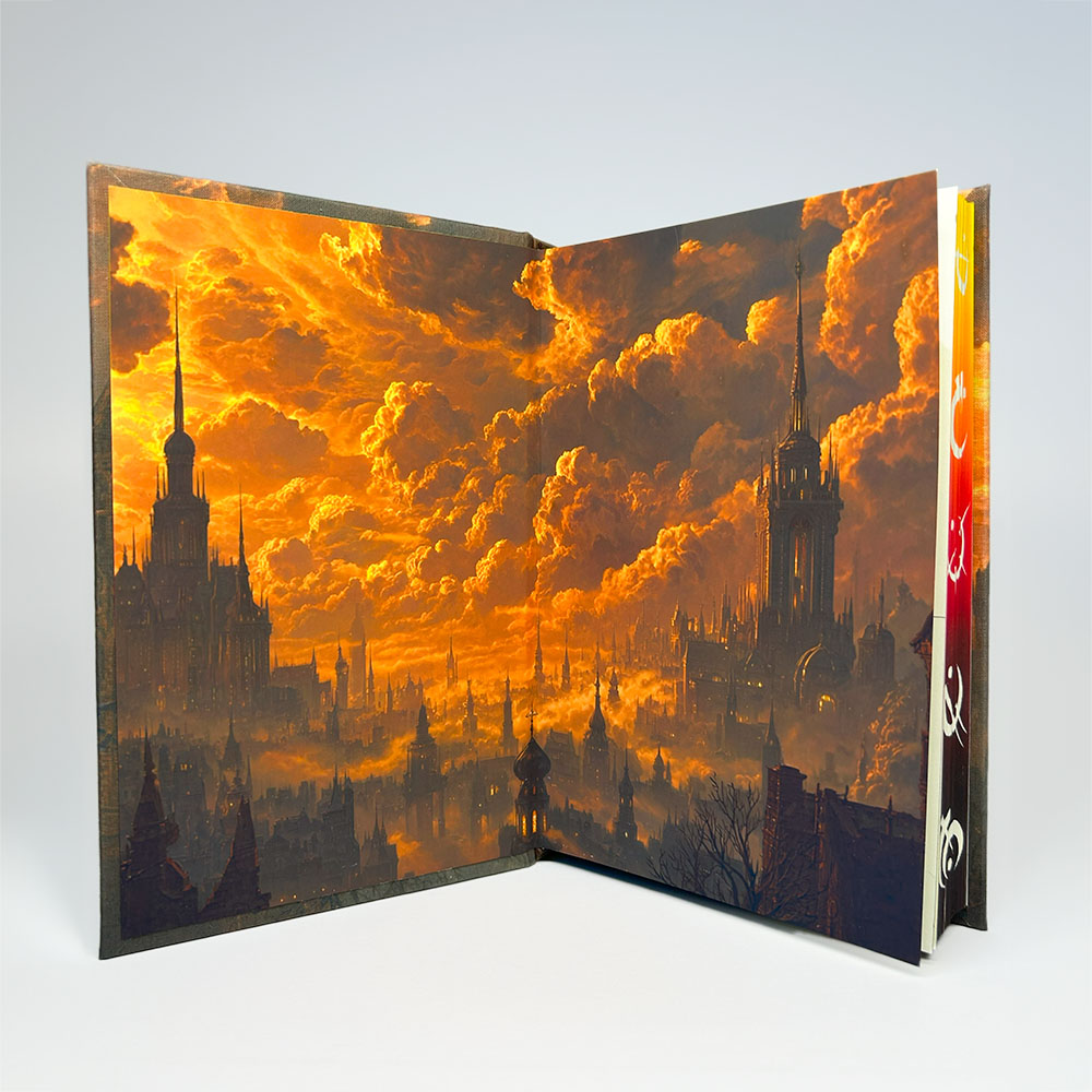 En el interior, las guardas ilustradas reproducen la ciudad al anochecer, atrapada entre la niebla y el fuego del crepúsculo.