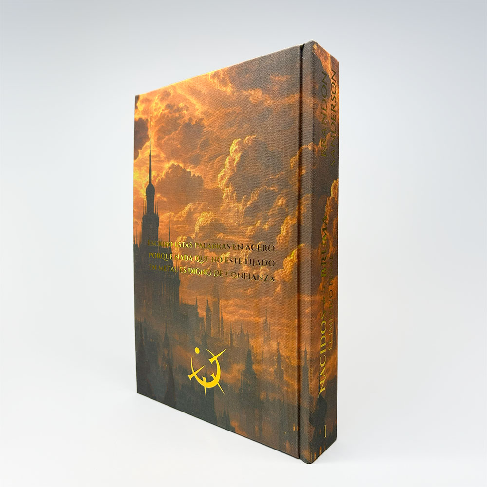 Esta edición parte del ejemplar original en tapa dura en español y ha sido transformada a mano con una cubierta que plasma el dramatismo del Imperio Final: cielos cubiertos de ceniza, siluetas sombrías y una ciudad bajo el yugo de la niebla.