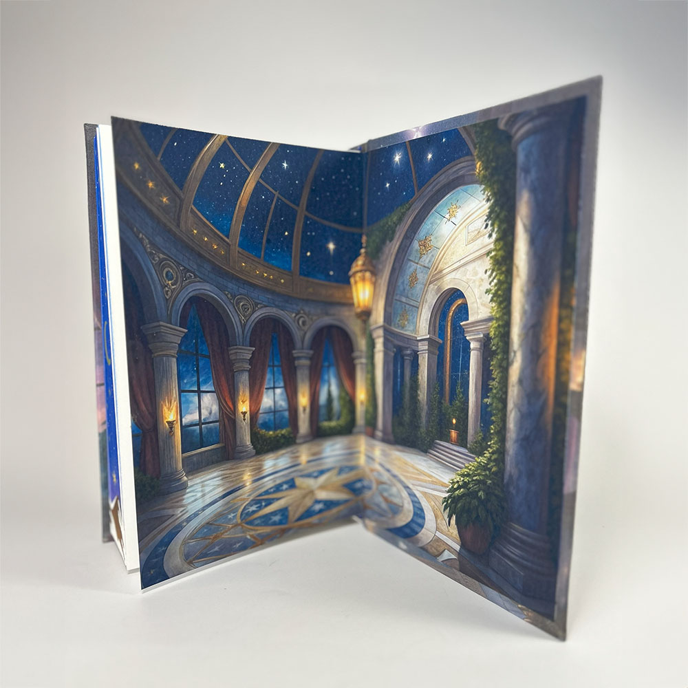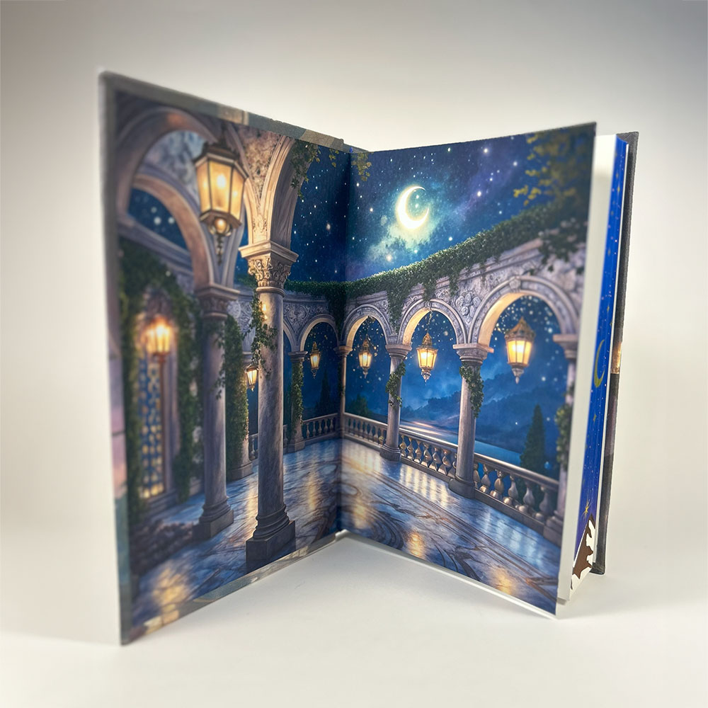 Los cantos están pintados a mano en un azul profundo, con detalles en dorado: estrellas, lunas y siluetas que evocan los cielos de Velaris. El interior incluye endpapers ilustrados con arquitecturas palaciegas bajo la noche estrellada, reflejando la belleza secreta de la Corte Noche.